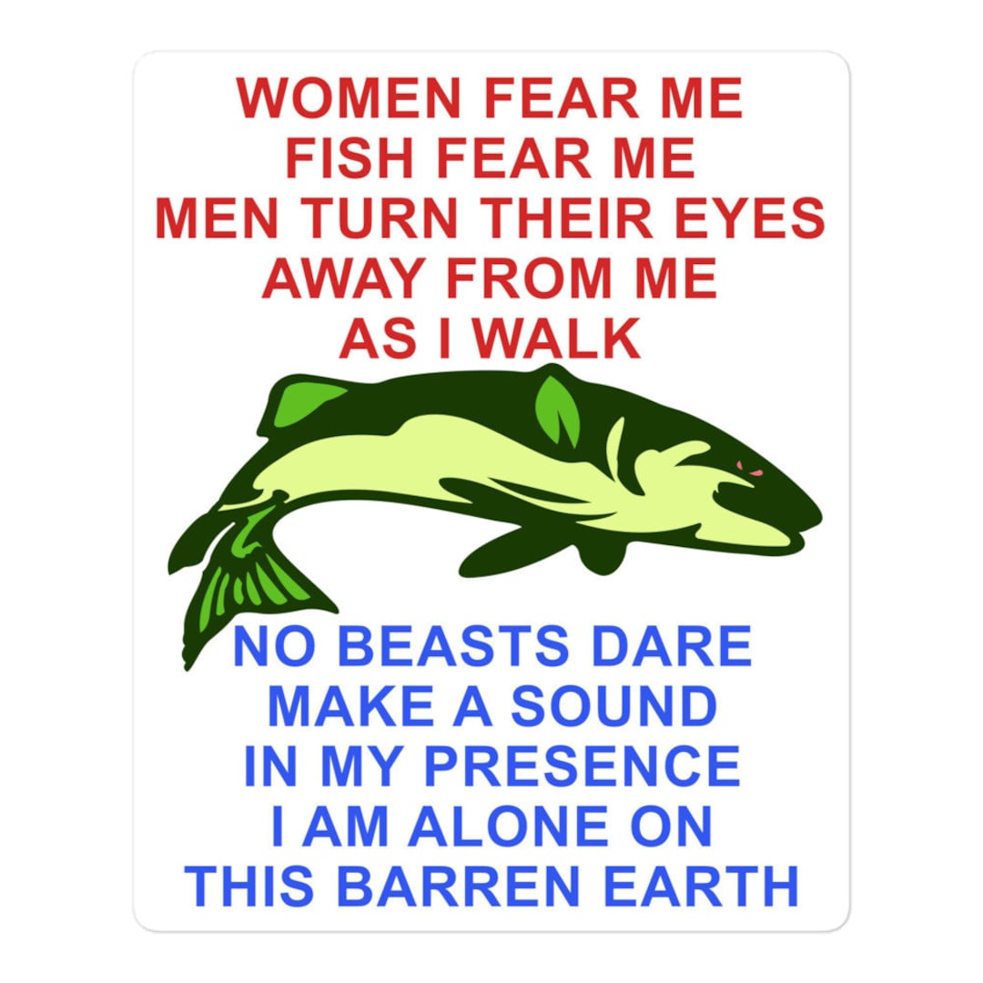 Women will fear you, fish will fear you; Printed text reads: WOMEN FEAR ME FISH FEAR ME MEN TURN THEIR EYES AWAY FROM ME AS I WALK NO BEASTS DARE MAKE A SOUND IN MY PRESENCE I AM ALONE ON THIS BAREN EARTH; DO NOT WEAR AT AQUARIUMS, KommandoStore is not responsible for any untoward events New Features: Improved mesh fabric FOR THE BOYS IN THE TRUCKS They usually say something about hunting, fishing, country life, etc, and the "women want me fish fear me" is one of them but it has kind of turned into a meme because people find it so funny